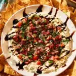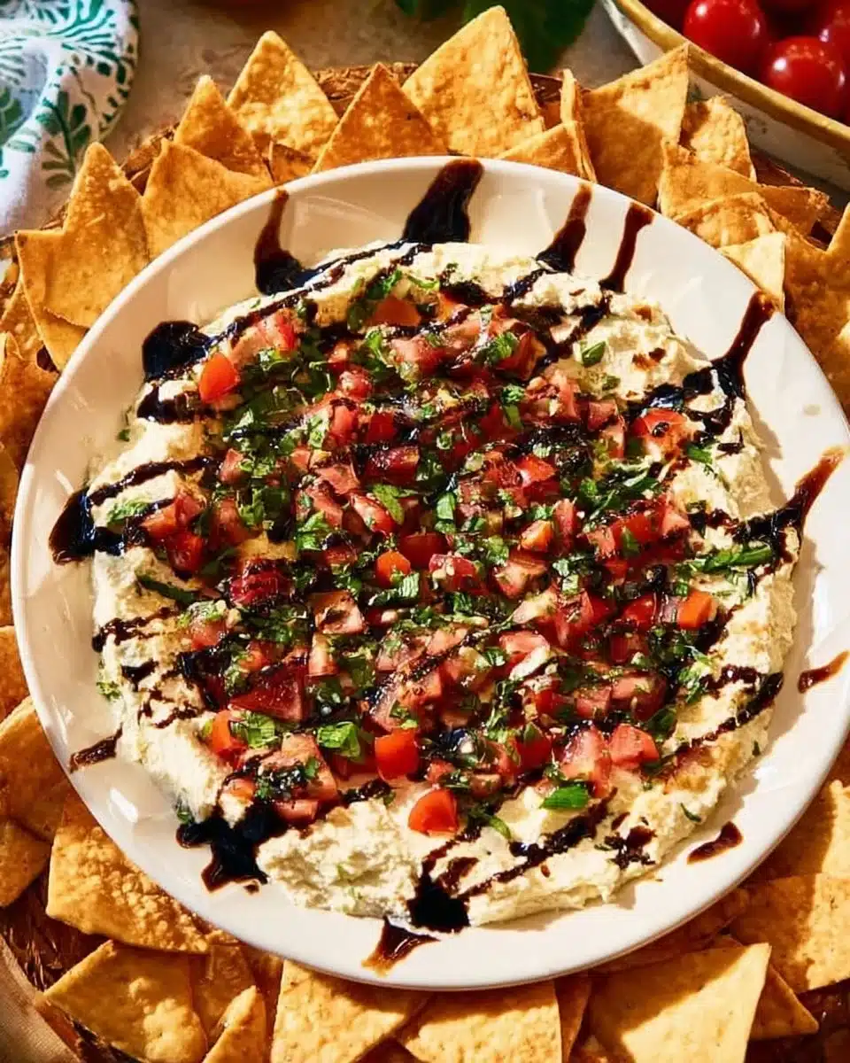 A creamy and vibrant bruschetta dip featuring fresh tomatoes, basil, and balsamic glaze, perfect for parties and gatherings.