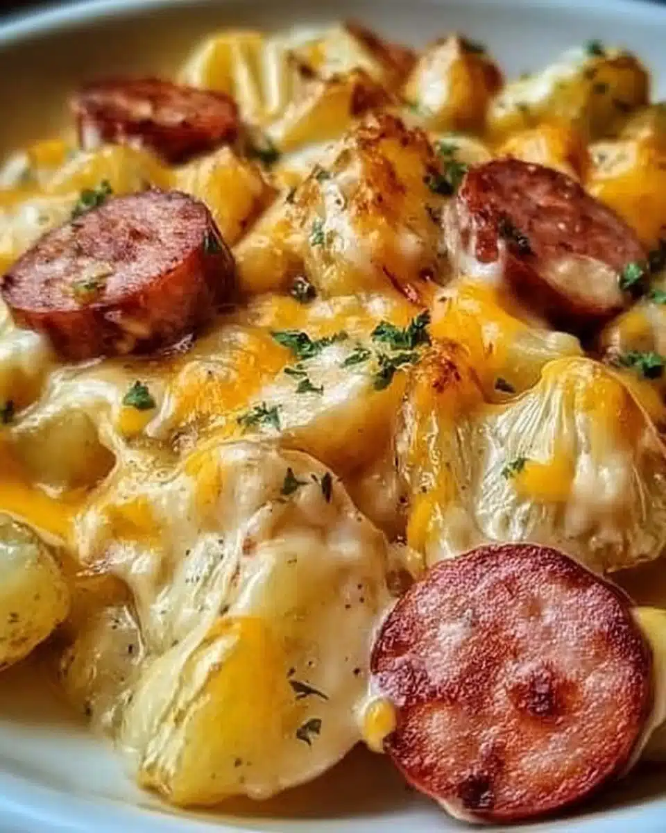Keywords: cheesy potatoes, smoked sausage, one-pan meal, easy dinner, comforting dish