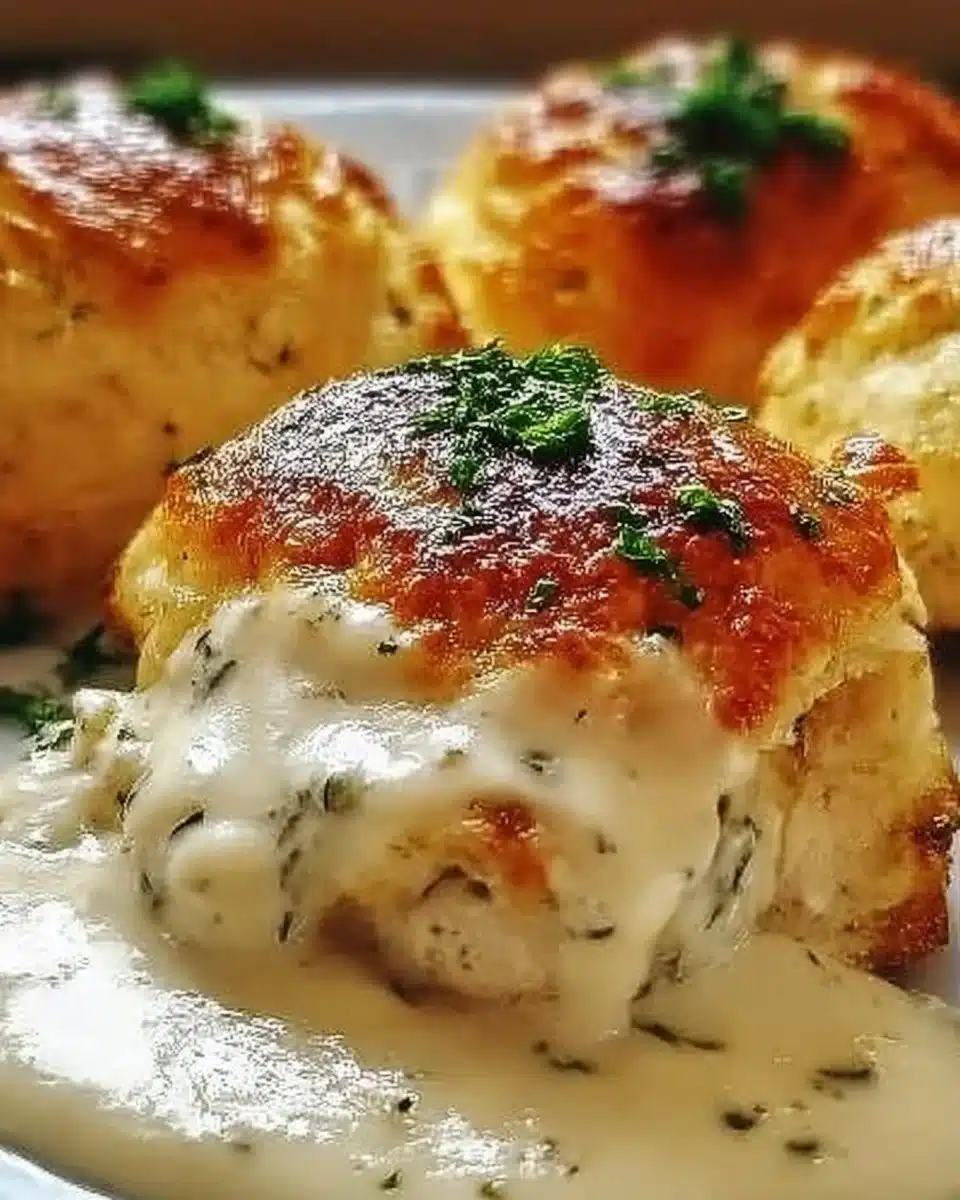Delightful, pillow-like pastries filled with tender chicken and smothered in a creamy Parmesan sauce, perfect for cozy evenings.