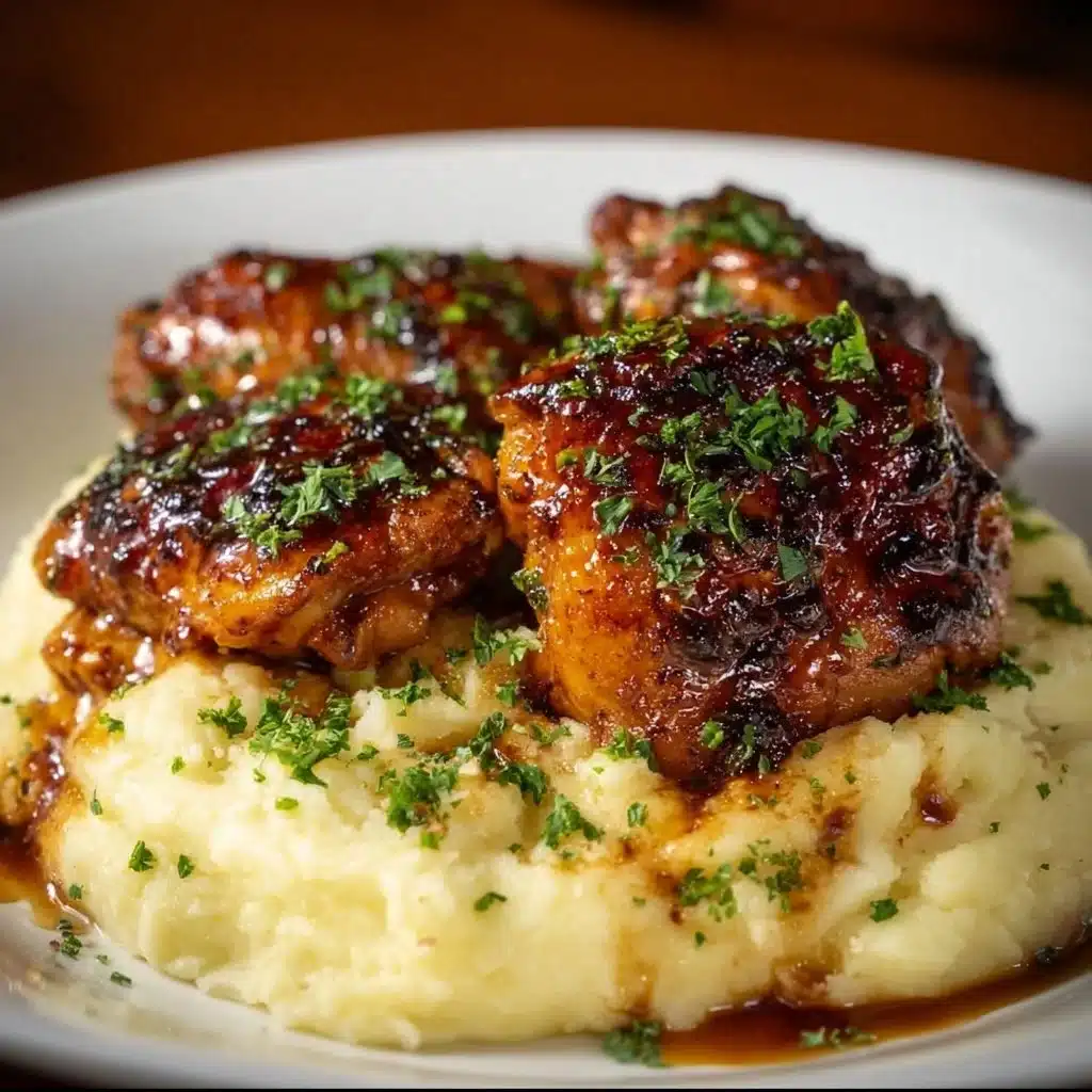 - Serve chicken thighs with smoked Gouda mashed potatoes, spooning any pan juices or remaining glaze over the chicken for shine and extra flavor. Garnish with a sprinkle of chopped parsley if you like a fresh contrast, and enjoy the contrast of crisp skin and velvety potatoes.