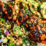 I do not recommend freezing fully assembled bowls because the avocado salsa will not freeze well. You can freeze cooked chicken and rice separately for up to two months, then thaw and finish with fresh salsa when ready to eat.
