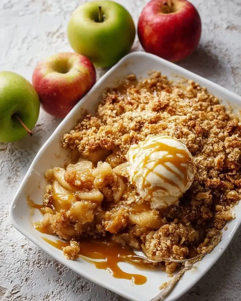 A comforting dessert featuring fresh tart apples topped with a crumbly buttery mixture, perfect for gatherings and pairs beautifully with ice cream.
