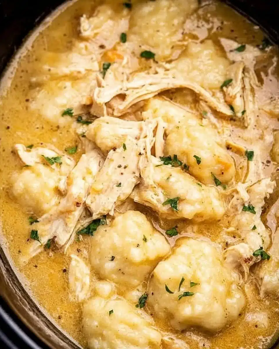 A comforting slow cooker dish with tender chicken and soft biscuit dumplings in a creamy sauce.