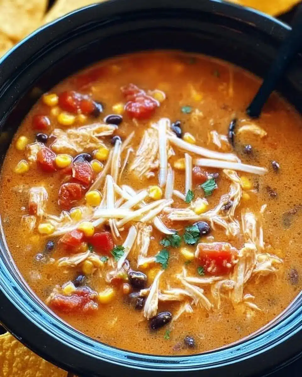A comforting and savory chicken tortilla soup made in a crockpot, featuring tender chicken, black beans, corn, and spices.