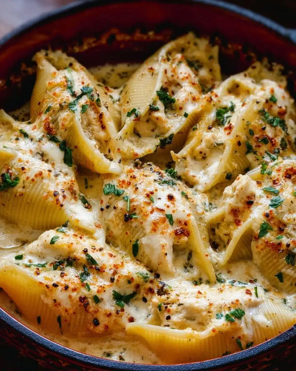 Comforting baked jumbo pasta shells stuffed with creamy garlic butter chicken and cheese, topped with melted mozzarella and parmesan.