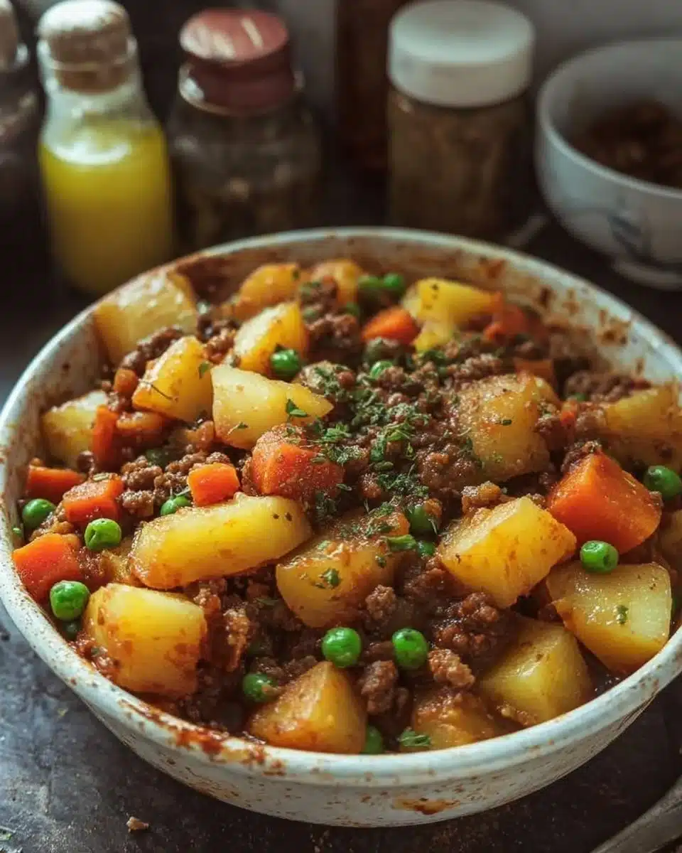 There’s something timeless about a warm bowl of ground beef and potatoes, the kind of comforting, hearty meal that feels right at home on a Southern lunch table. This dish is cozy, filling, and made with simple ingredients: tender potatoes, savory seasoned hamburger, and colorful veggies all simmered together into a rich, spoonable skillet meal.