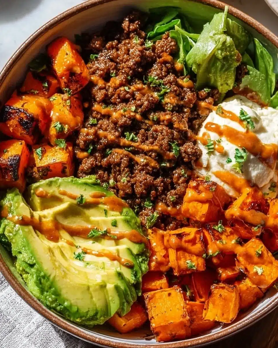 Ground Beef Hot Honey Bowl is more than just a meal; it’s a symphony of flavors and textures. The fluffy sweet potatoes offer a light sweetness that balances perfectly with the savory notes of the seasoned beef, creating an orchestra of taste in every bite. Here’s why you’ll love it: