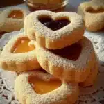 Elegant heart-shaped cookies with a buttery texture and a delicious jam filling, perfect for Valentine’s Day or any festive occasion.