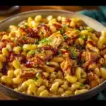 A creamy mac and cheese with a sweet smoky lift, featuring shredded chicken and a glossy BBQ-honey sauce, perfect for family dinners or meal prep.