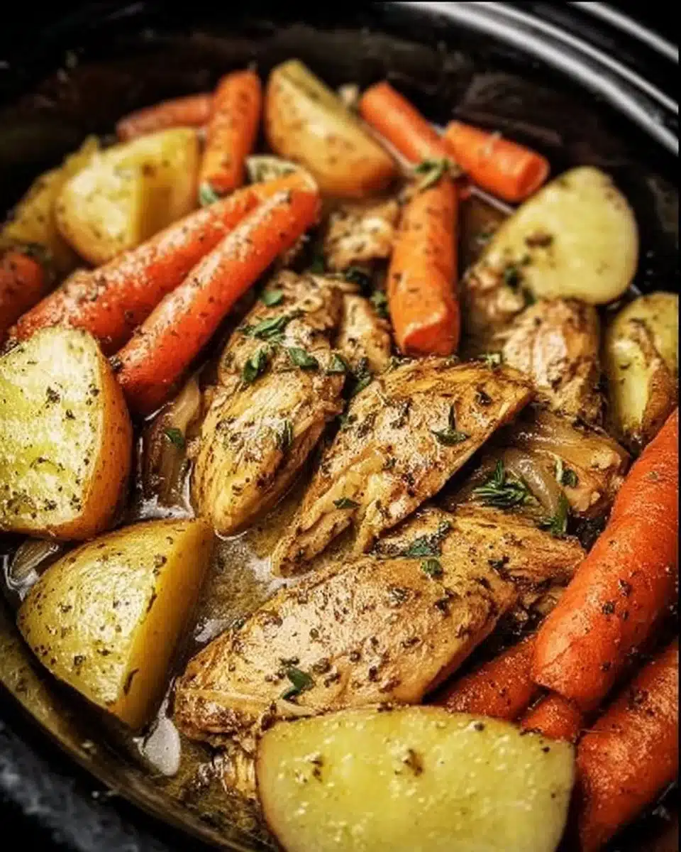 There is a little magic in slow cooking, and with garlic butter as the base, you get rich, rounded flavor that penetrates each vegetable and the chicken itself. The butter carries the garlic and dried herbs into the meat and vegetables, making each bite feel cohesive and comforting. Because the flavors are simple and focused, the result tastes fresh and homemade rather than heavy.