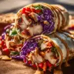 This wrap balances savory, sweet, salty, and bright notes in every bite. Tender, marinated chicken brings deep, savory flavor, while a creamy peanut sauce adds richness and a little heat, and the slaw contributes a crisp, vinegary counterpoint that keeps each mouthful lively. Together they create a contrast of textures, with soft tortilla, succulent chicken, and crunchy vegetables.